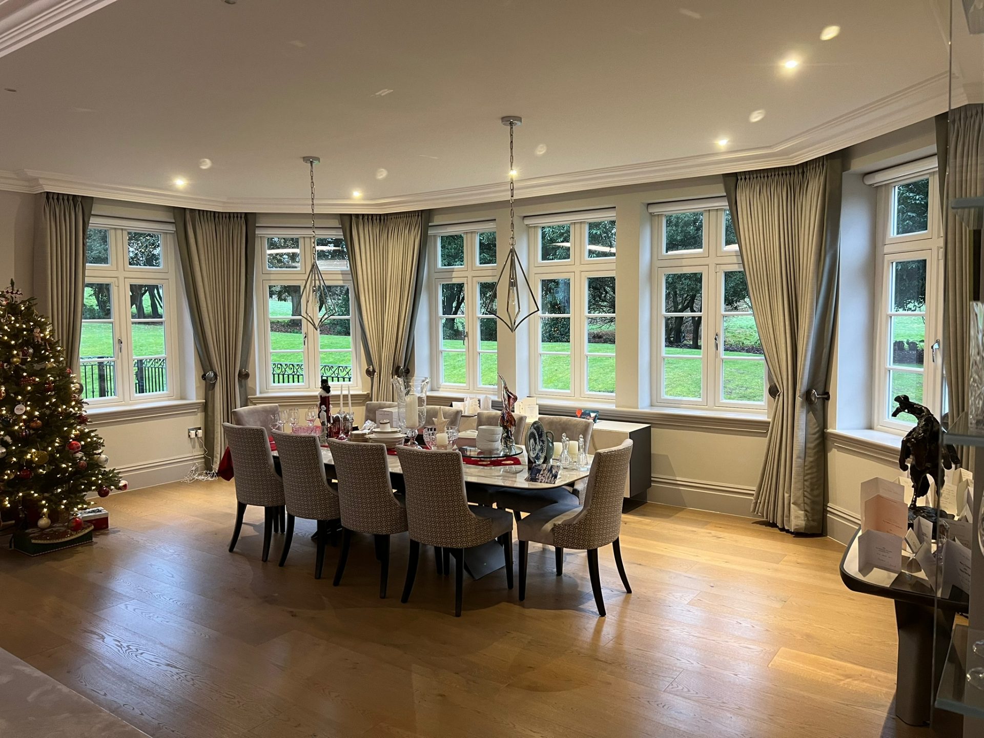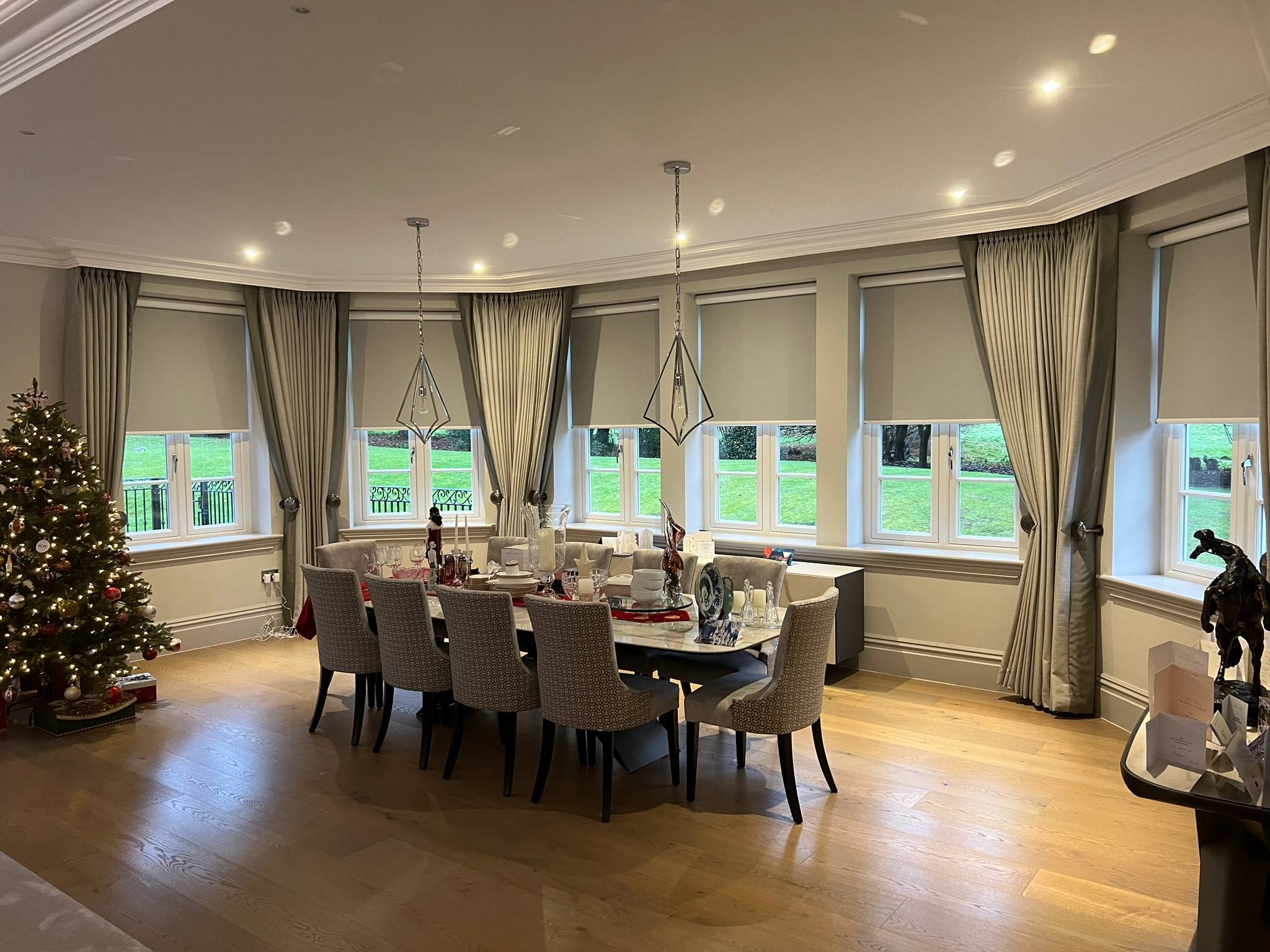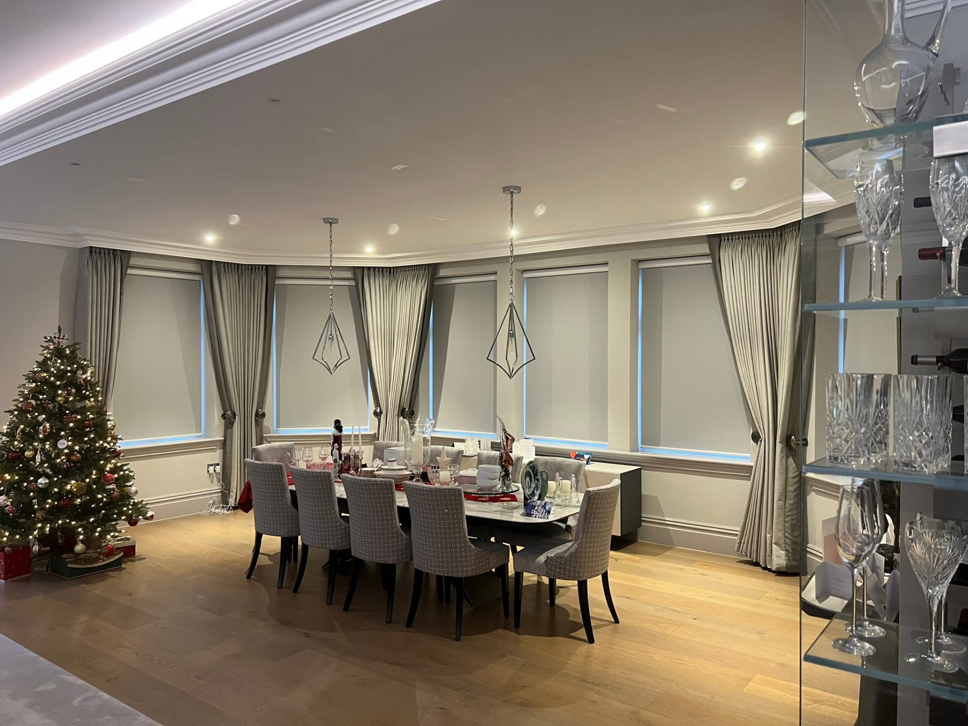 With control at the touch of a button, these sleek and stylish cassetted Roller blinds in fabric “Banlight Duo FR – Silver” add the perfect finishing touch to this beautiful dining room.