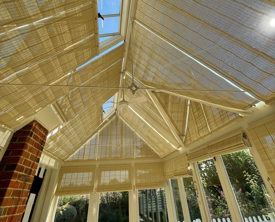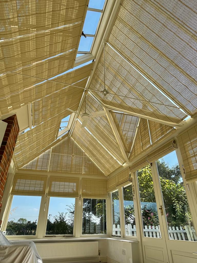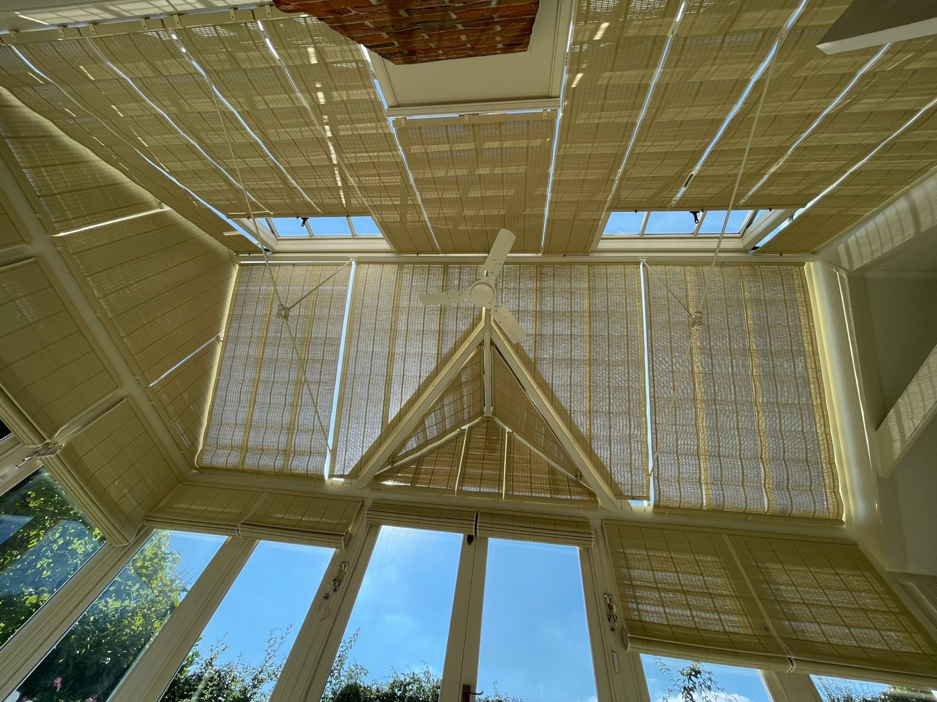 Our Design Consultant opted to refresh the Original French Pinoleum with a lighter, more natural colour choice. Impeccably surveyed and installed by our team, it's safe to say we have totally transformed this stunning conservatory with a grand total of 33 Original French Pinoleum blinds in colour 'Fine Twine'.